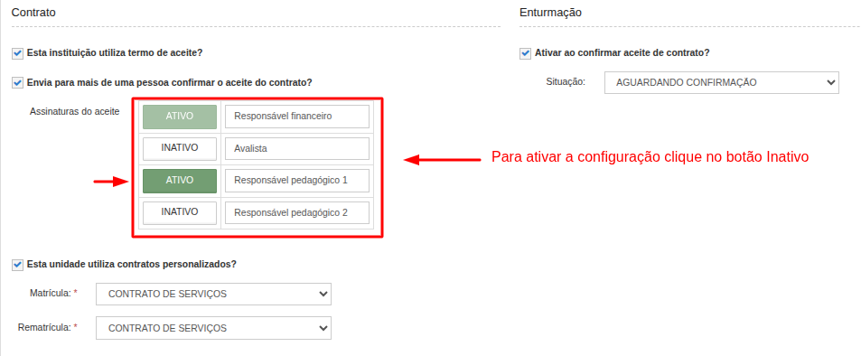 Ao ativar a opção Envia para mais de uma pessoa confirmar o aceite do contrato? Você pode definir os responsáveis vinculados ao aluno que podem realizar a assinatura do contrato.