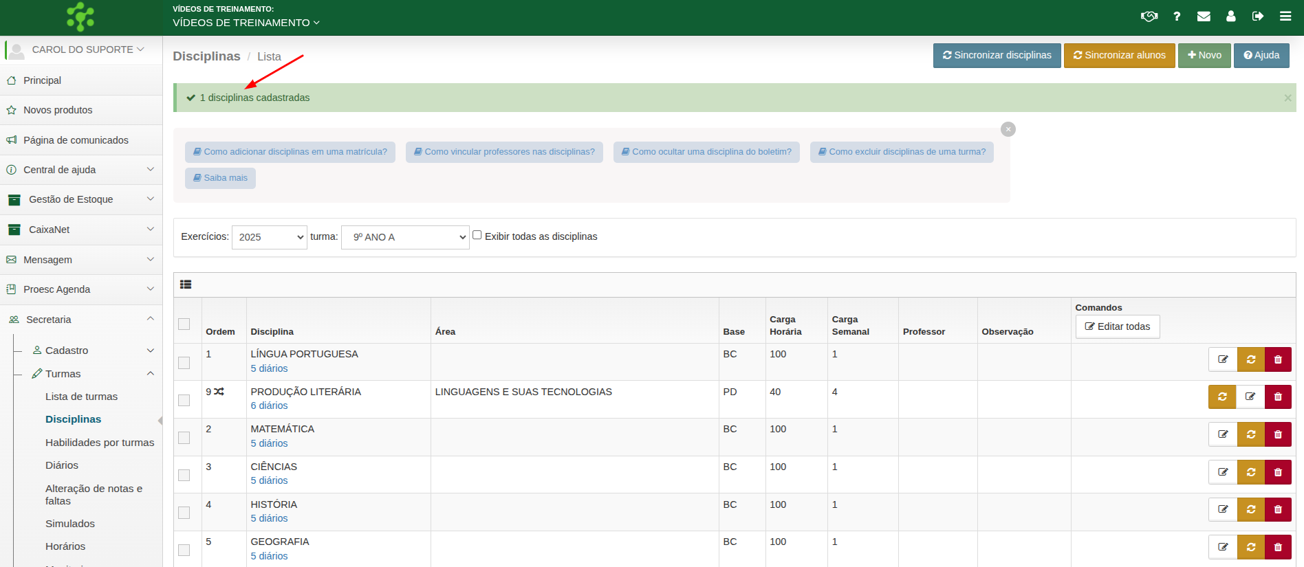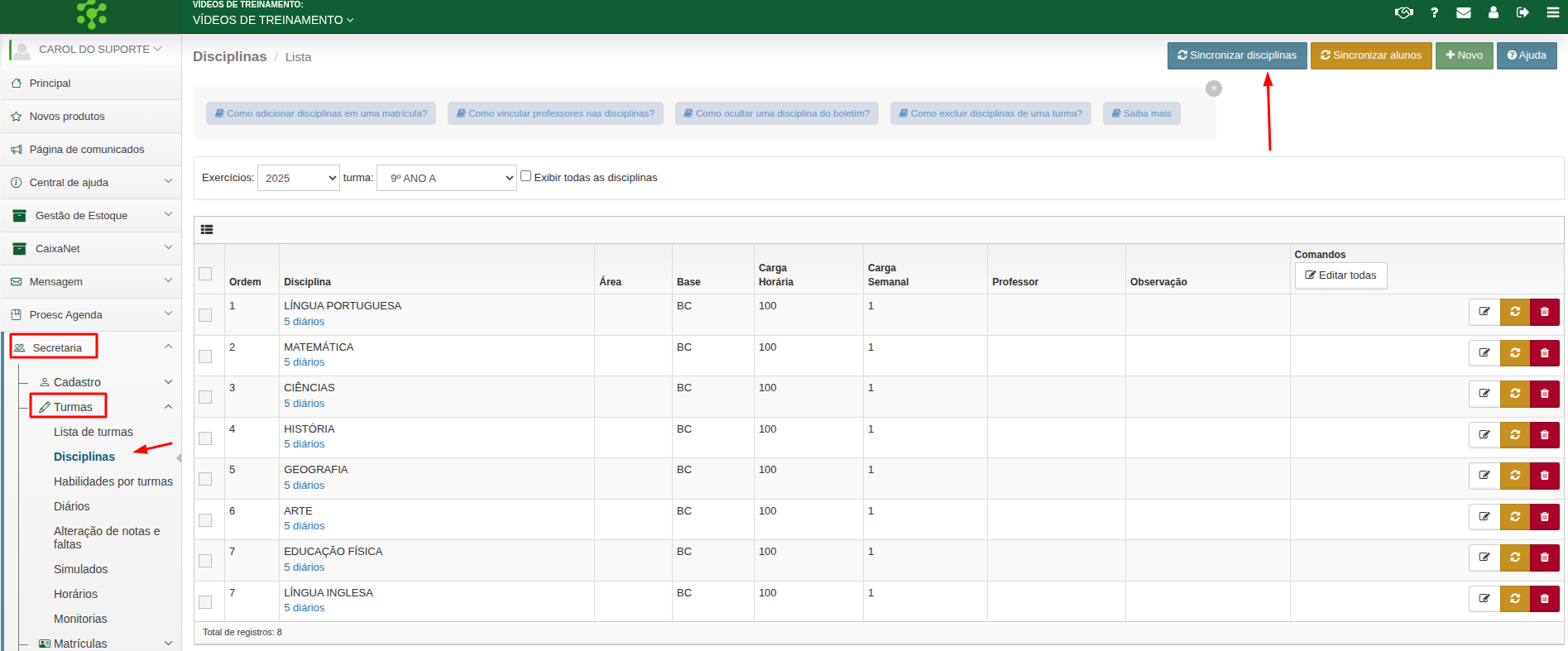 1 - No menu Secretária submenu Turmas item Disciplinas filtre o exercício e a turma. Localize o botão de "Sincronizar disciplinas" e clique nele.
