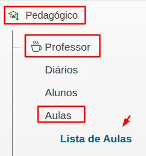 Acesse o menu lateral Pedagógico > Professor > Aulas > Lista de aulas.