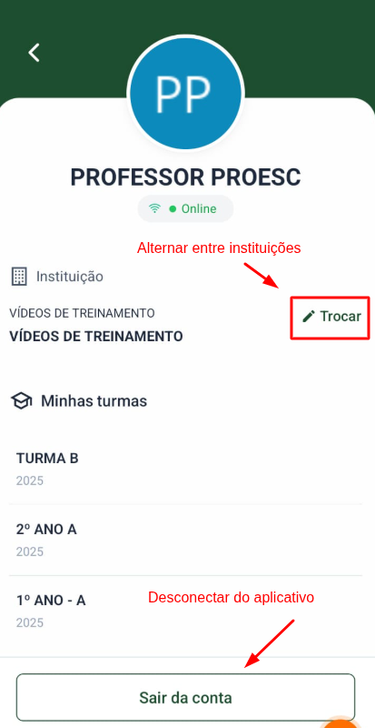 4. Caso seja professor em mais de uma instituição, ao clicar no seu perfil de usuário no canto superior, você consegue realizar a troca de instituição ao clicar em Trocar ao lado do registro.