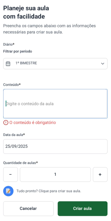 Para registrar uma nova aula, o professor clica no botão verde de “+” e é direcionado a um formulário intuitivo: