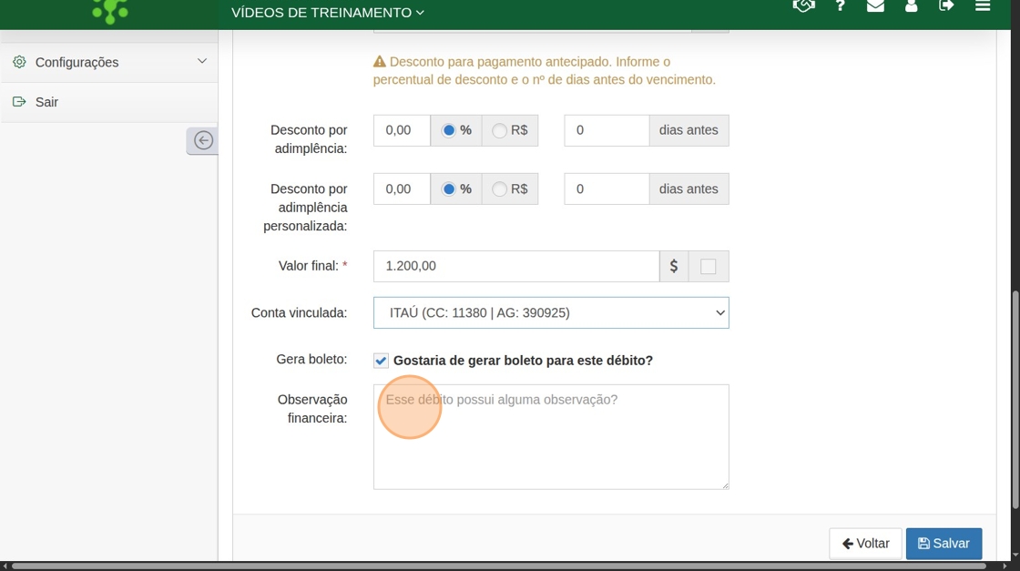 12. Clique no botão gerar Boleto, caso deseje criar o débito já com os boletos gerados e adicione uma observação caso necessário.