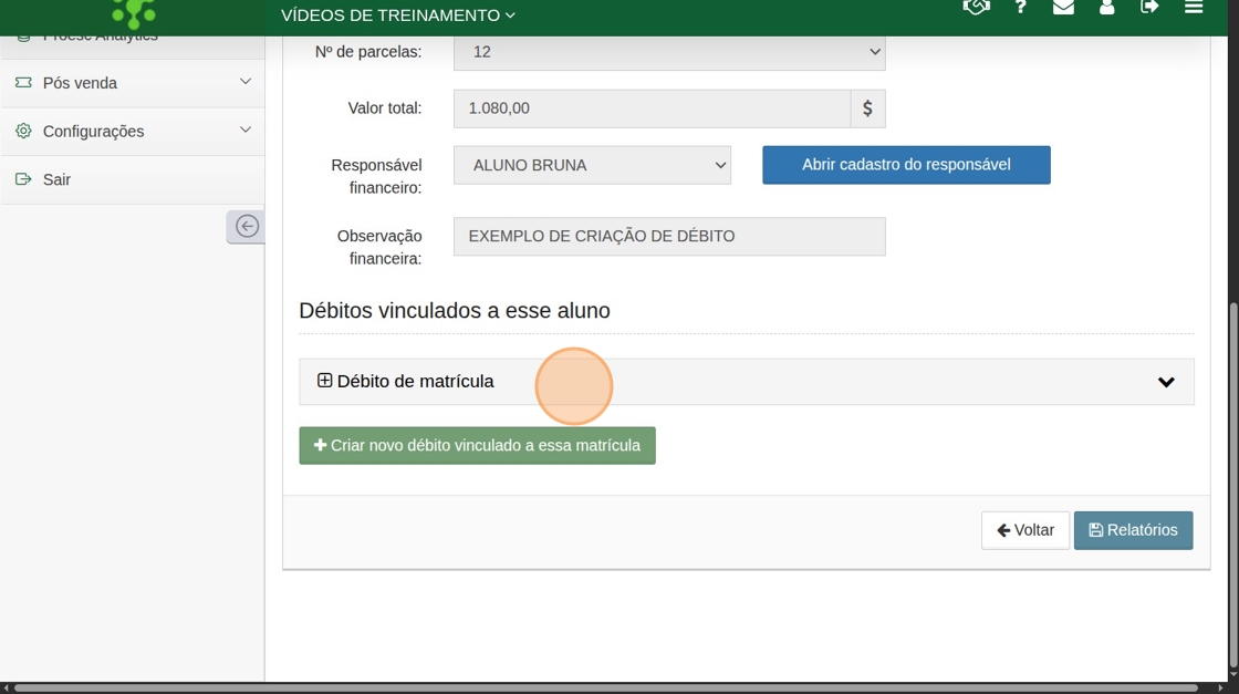 15. Você pode clicar em "Débito de matrícula" para visualizar as parcelas criadas neste débito.