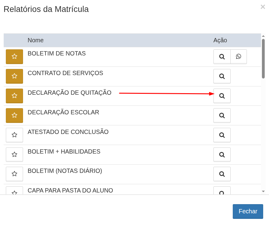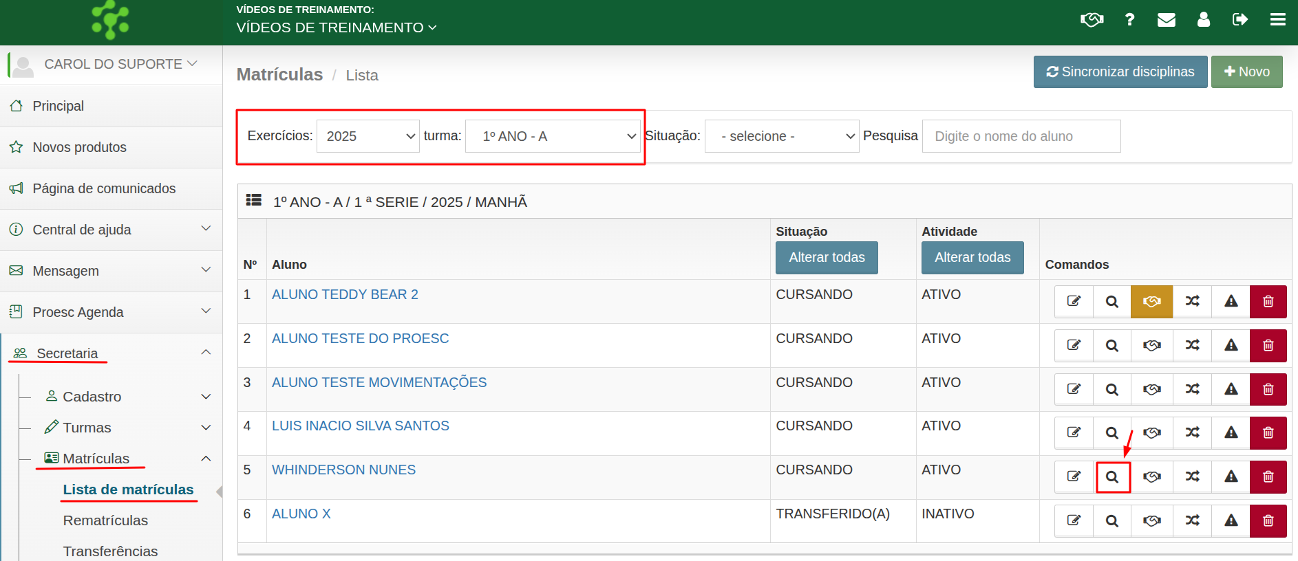 - Clique no registro do aluno no ícone de lupa para verificar os relatórios de matrícula