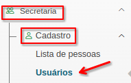 Primeiro, acesse o menu lateral Secretária submenu Cadastro item Usuários: