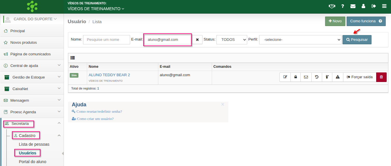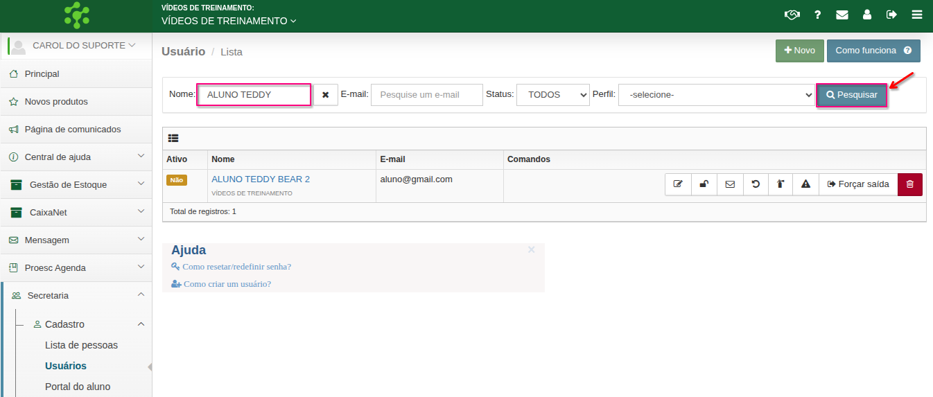 Após isso, localize o usuário pesquisando pelo seu nome ou e-mail na caixa de pesquisa e clique no botão Pesquisar.