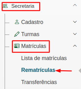 Primeiramente para efetuar a rematrícula de um aluno, acesse o menu Secretária submenu Matrículas, na opção Rematrículas: