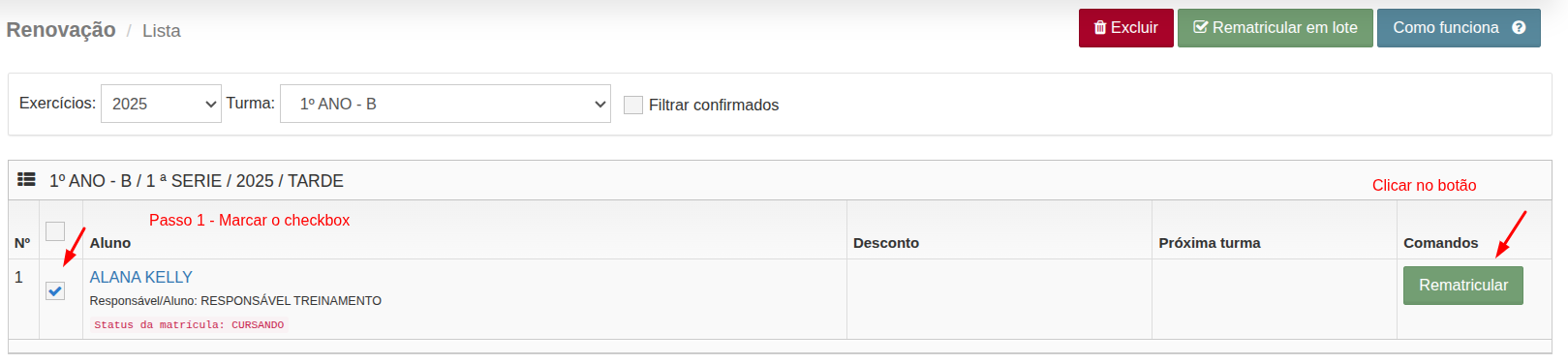 Para dar segmento na rematrícula do aluno teremos primeiro que marcar o checkbox ao lado do nome do aluno:
