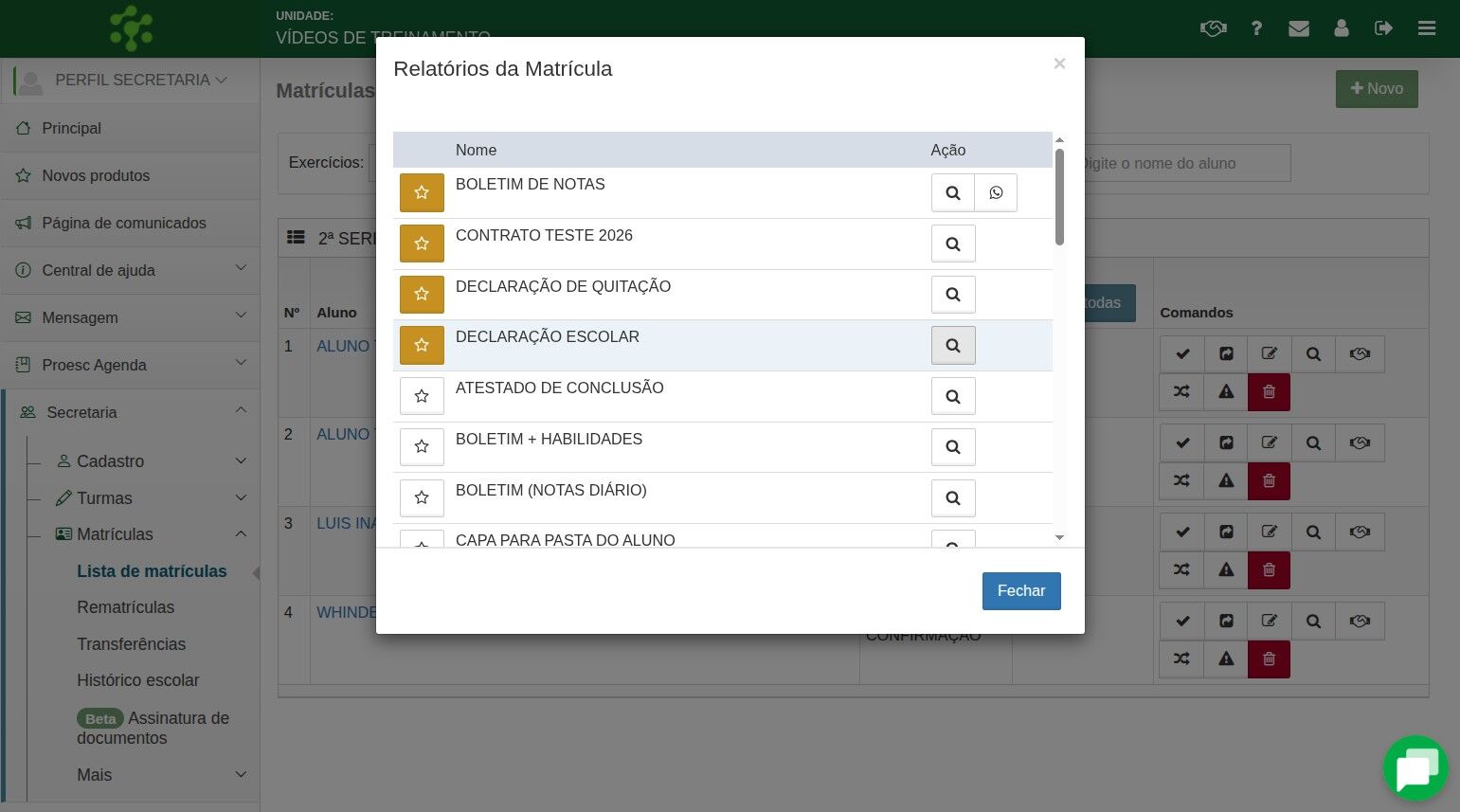 5. Na janela aberta em relatórios da matrícula busque por Declaração escolar e clique novamente na lupa