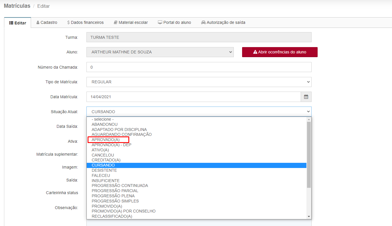Dessa forma, a situação do aluno será alterada de CURSANDO para Aprovado, Reprovado, etc.