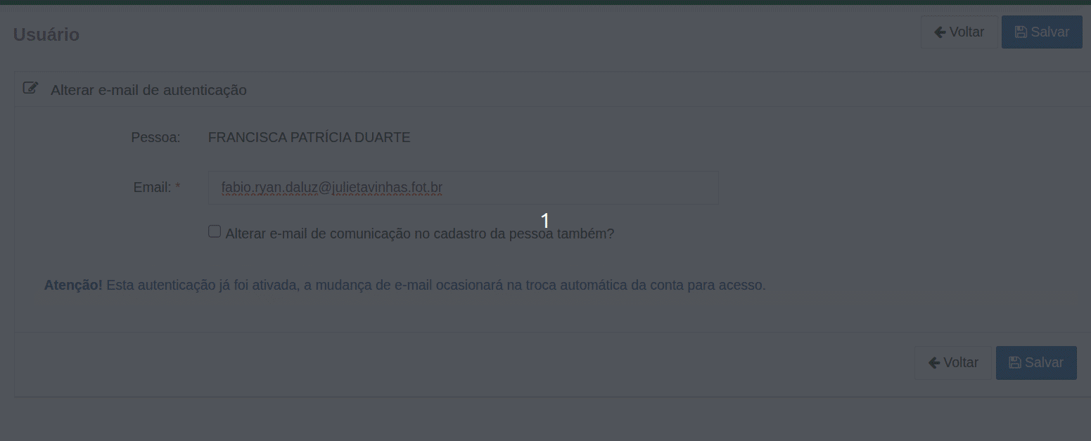 Caso queira atualizar também o e-mail do cadastro de pessoa, marque a opção Alterar e-mail de comunicação no cadastro da pessoa também?