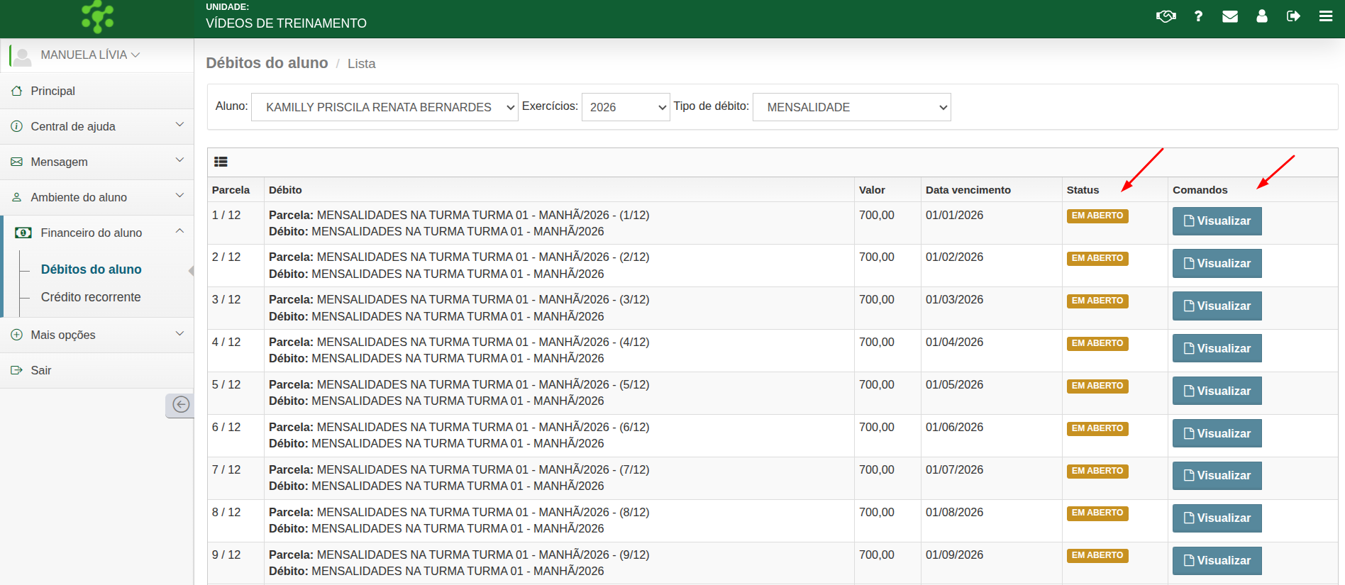 2. Em seguida clique no menu Financeiro do aluno > Débitos do aluno