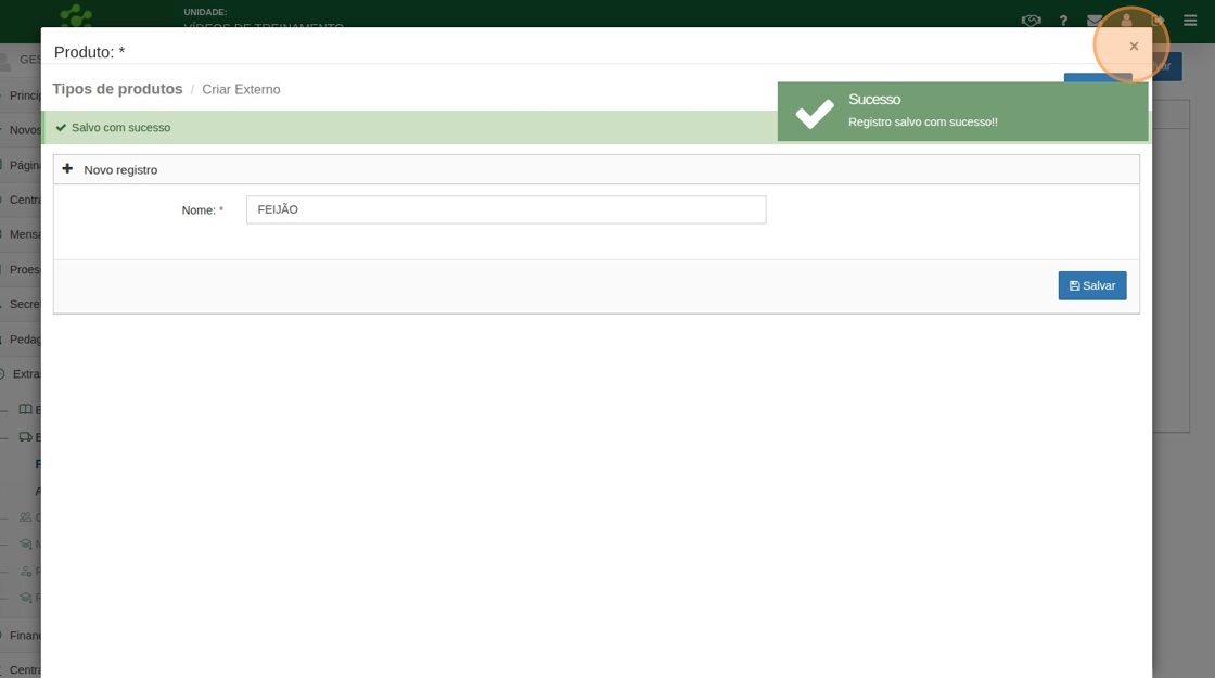 8. Logo o sistema informará uma mensagem de registro salvo com sucesso!