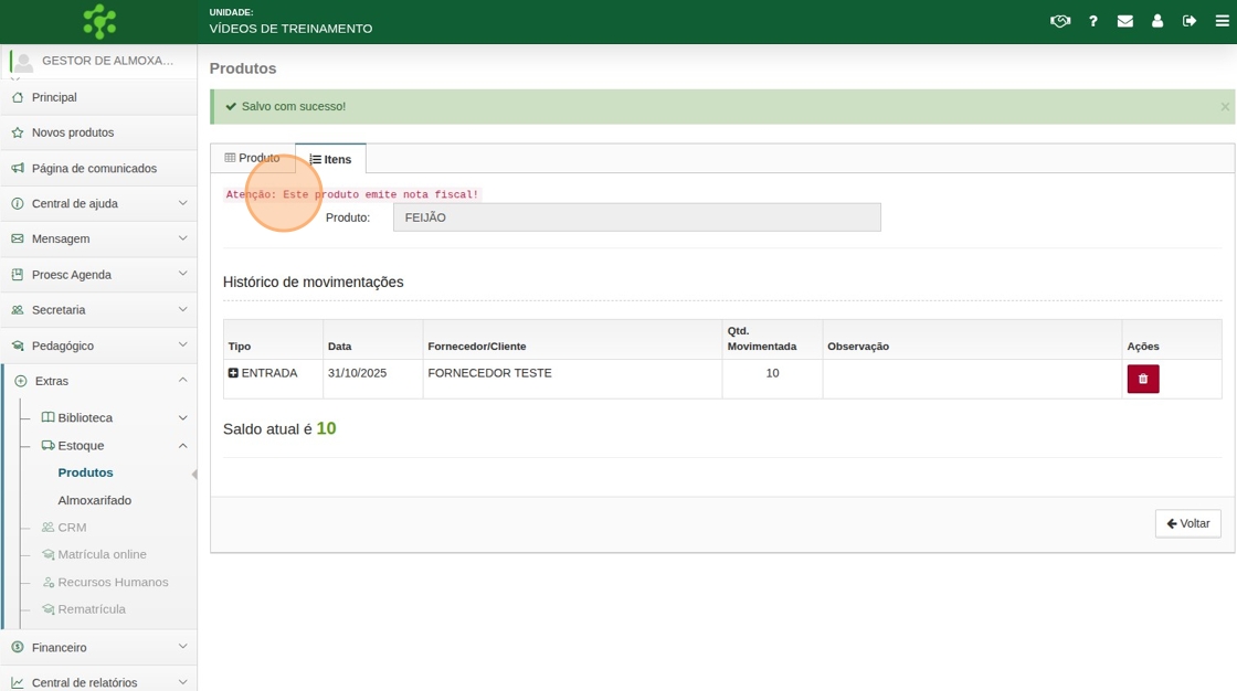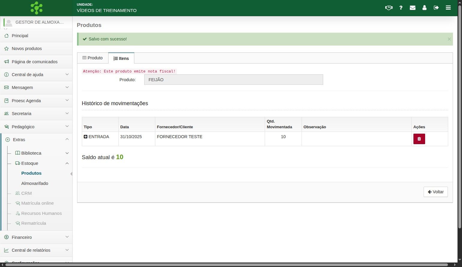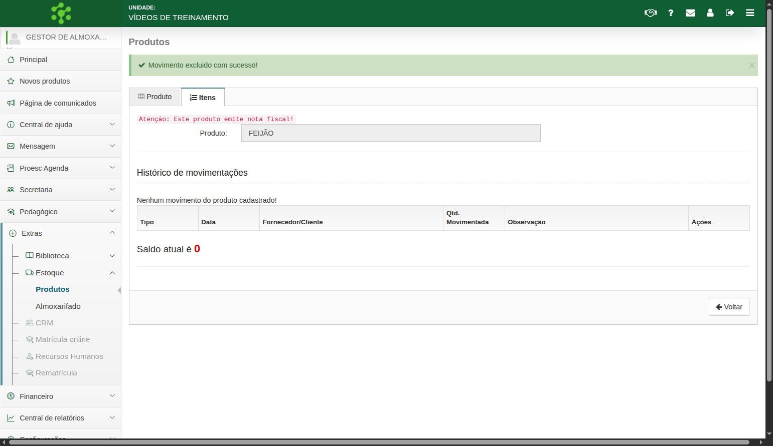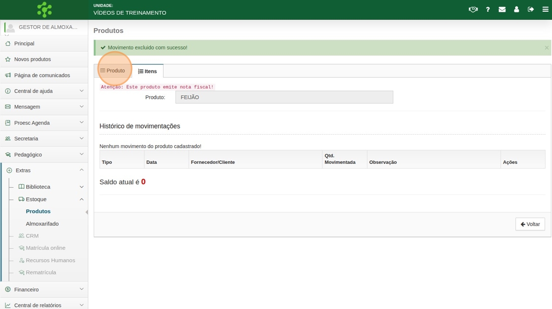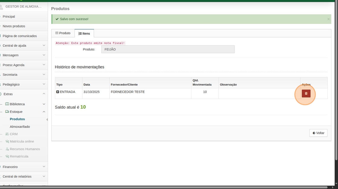 25. No ambiente de Itens, no histórico de movimentações é possível excluir o produto no ícone de lixeira.