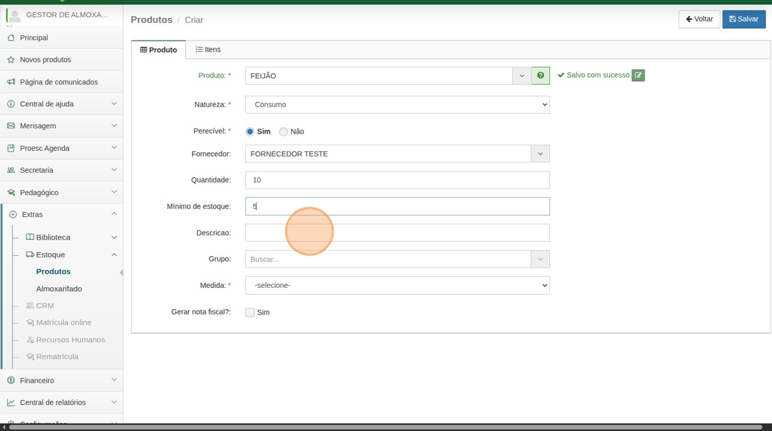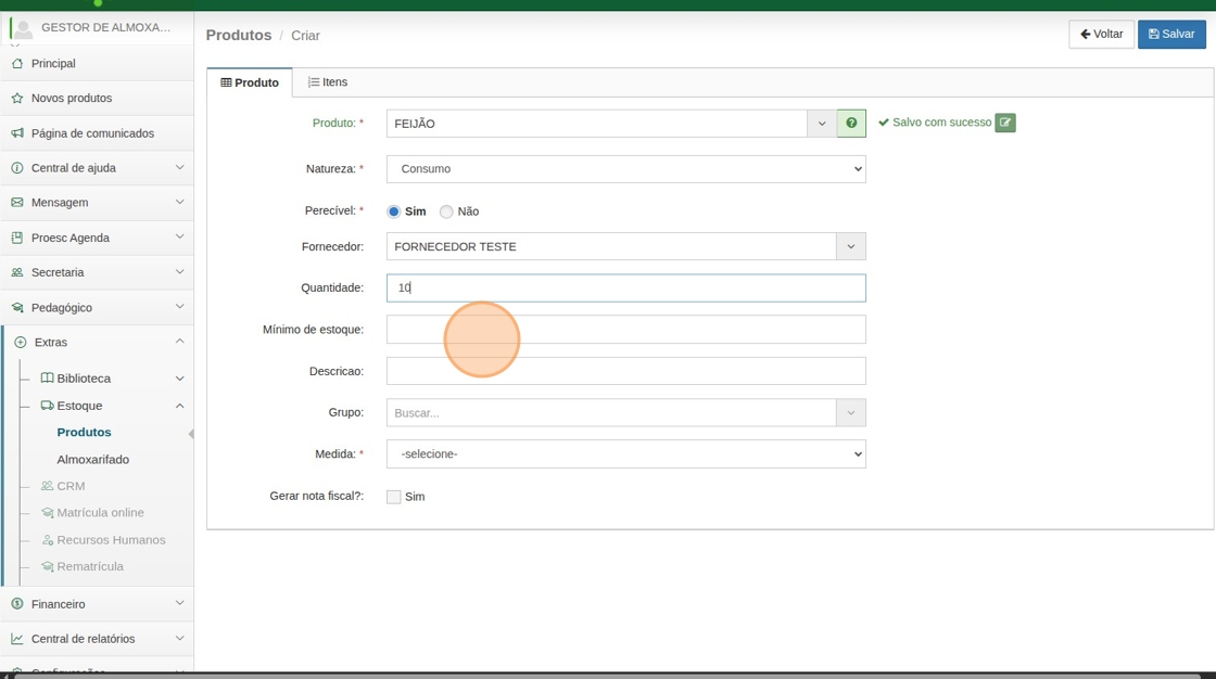 14. Informe a quantidade minima de estoque no campo "Mínimo de estoque:"