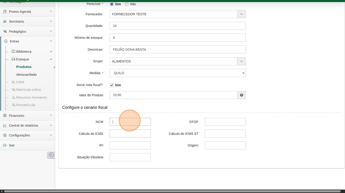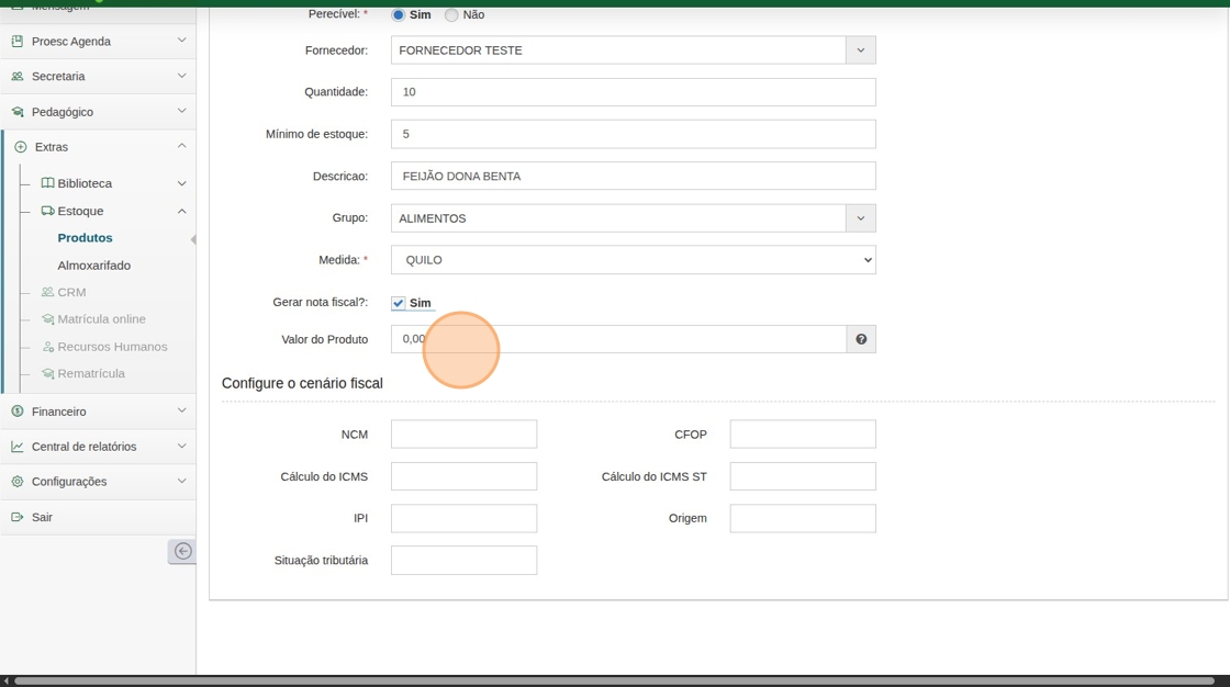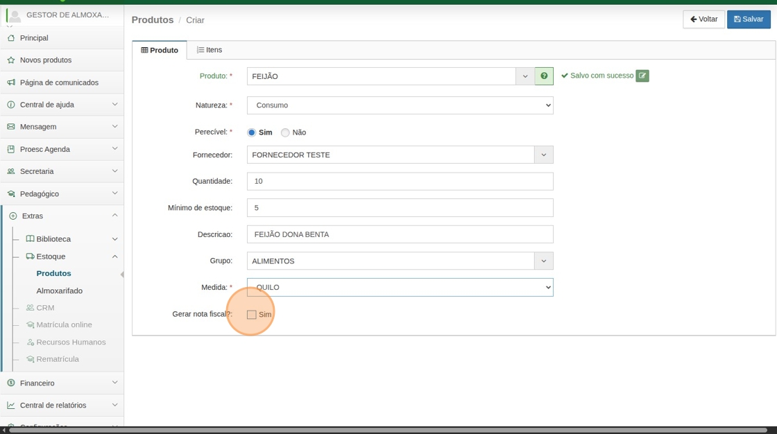 23. Note que ativando a emissão de nota o sistema informa que a mensagem "Atenção: Este produto emite nota fiscal!"