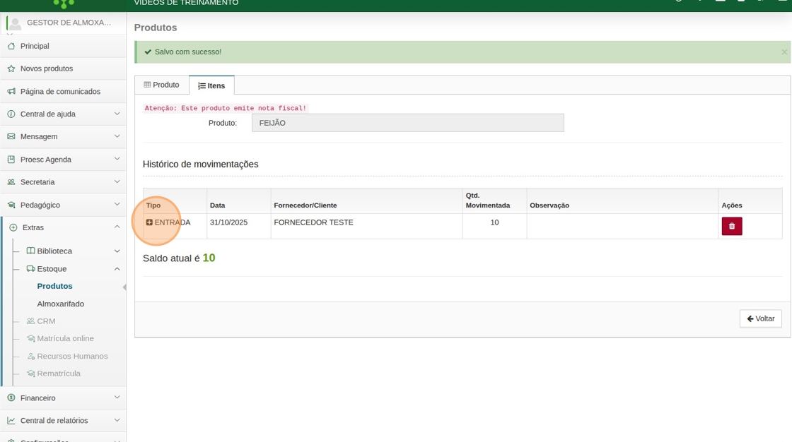 24. Você consegue identificar no histórico de movimentações se ouve uma "ENTRADA" ou "SAÍDA" do produto.