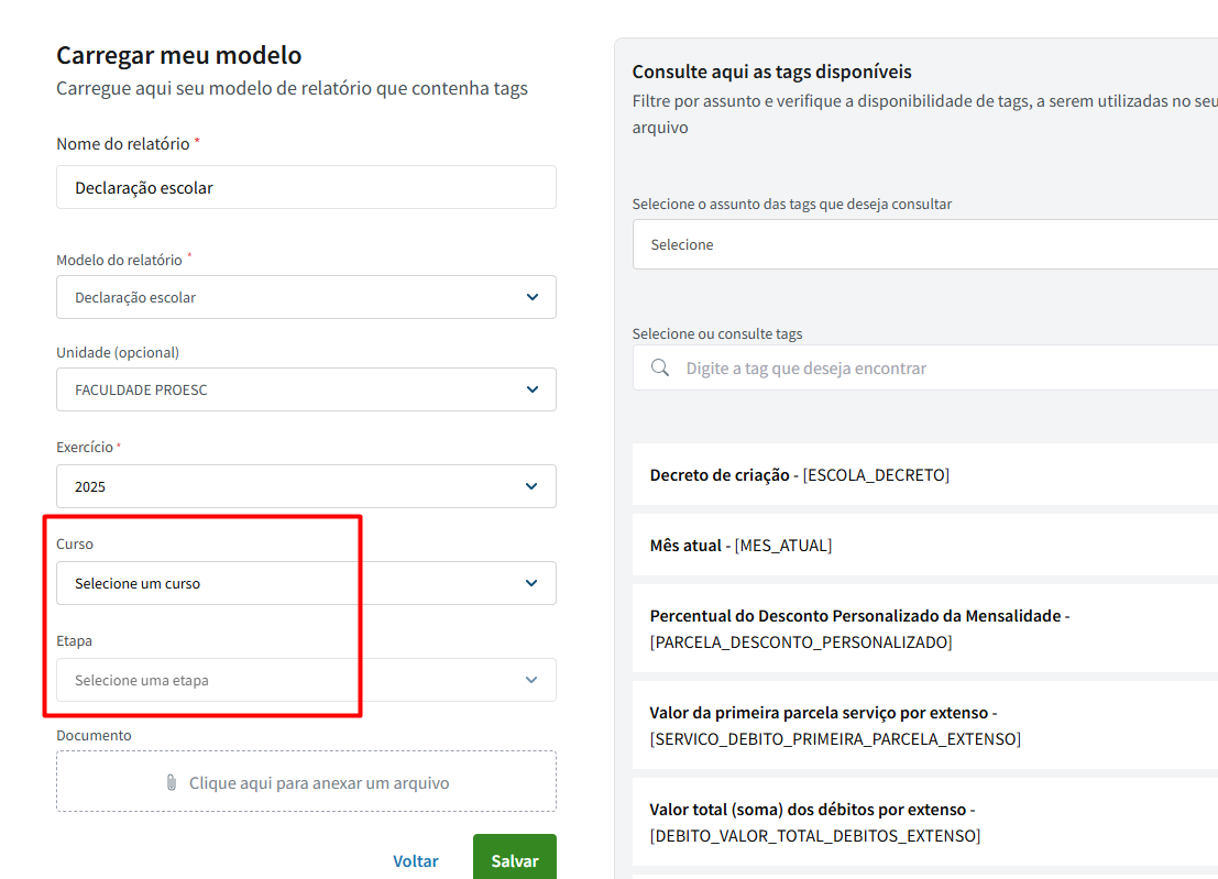 Desse modo, automaticamente o sistema compreende que aquele documento é somente para o curso assinalado, sendo assim, ele será emitido exclusivamente à turma/curso em questão e não será possível a mudança quando já salvo, pois é feito o bloqueio da possibilidade de alteração, de acordo com o print abaixo: