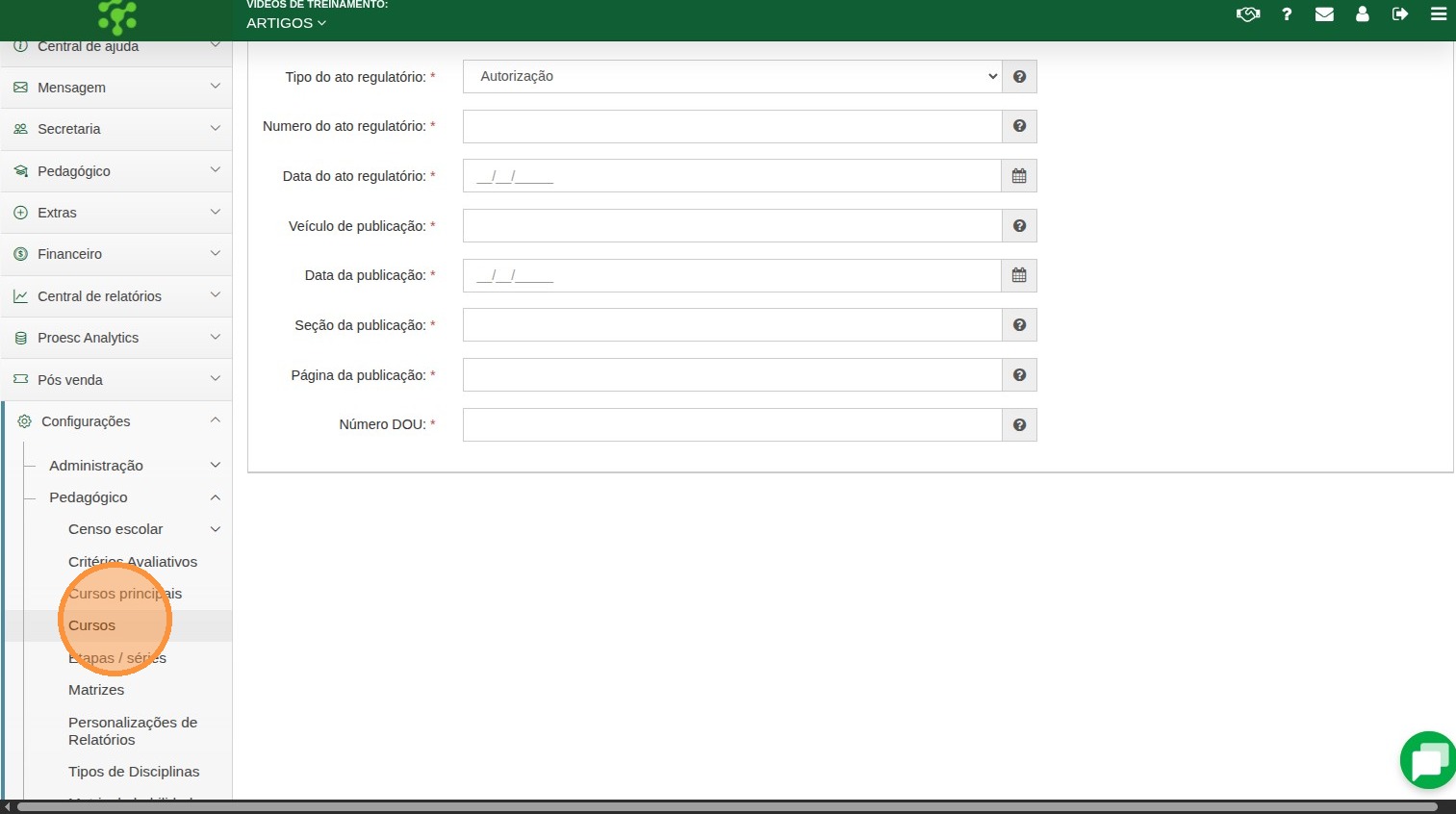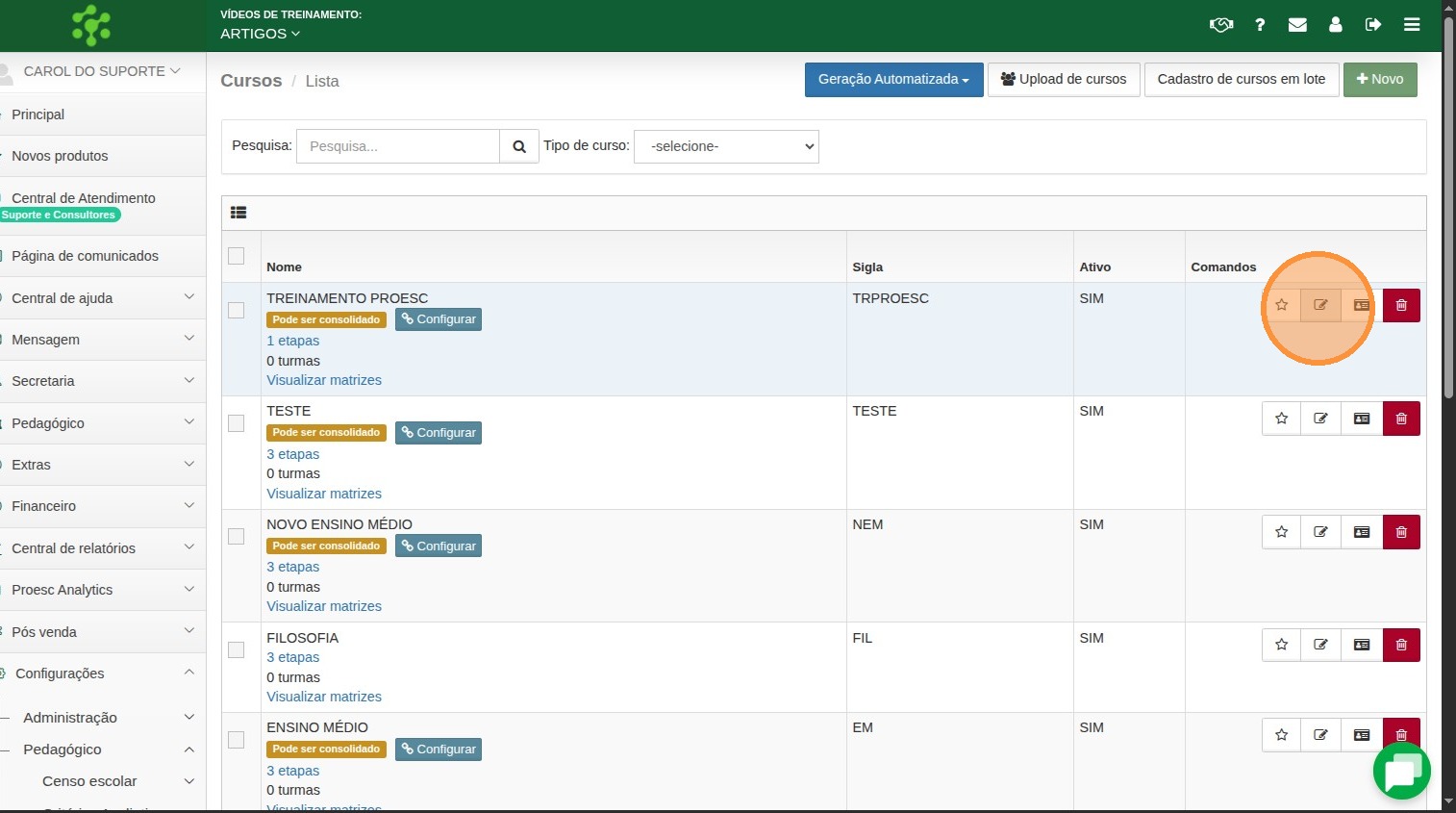 Configurações → Pedagógico→ Cursos