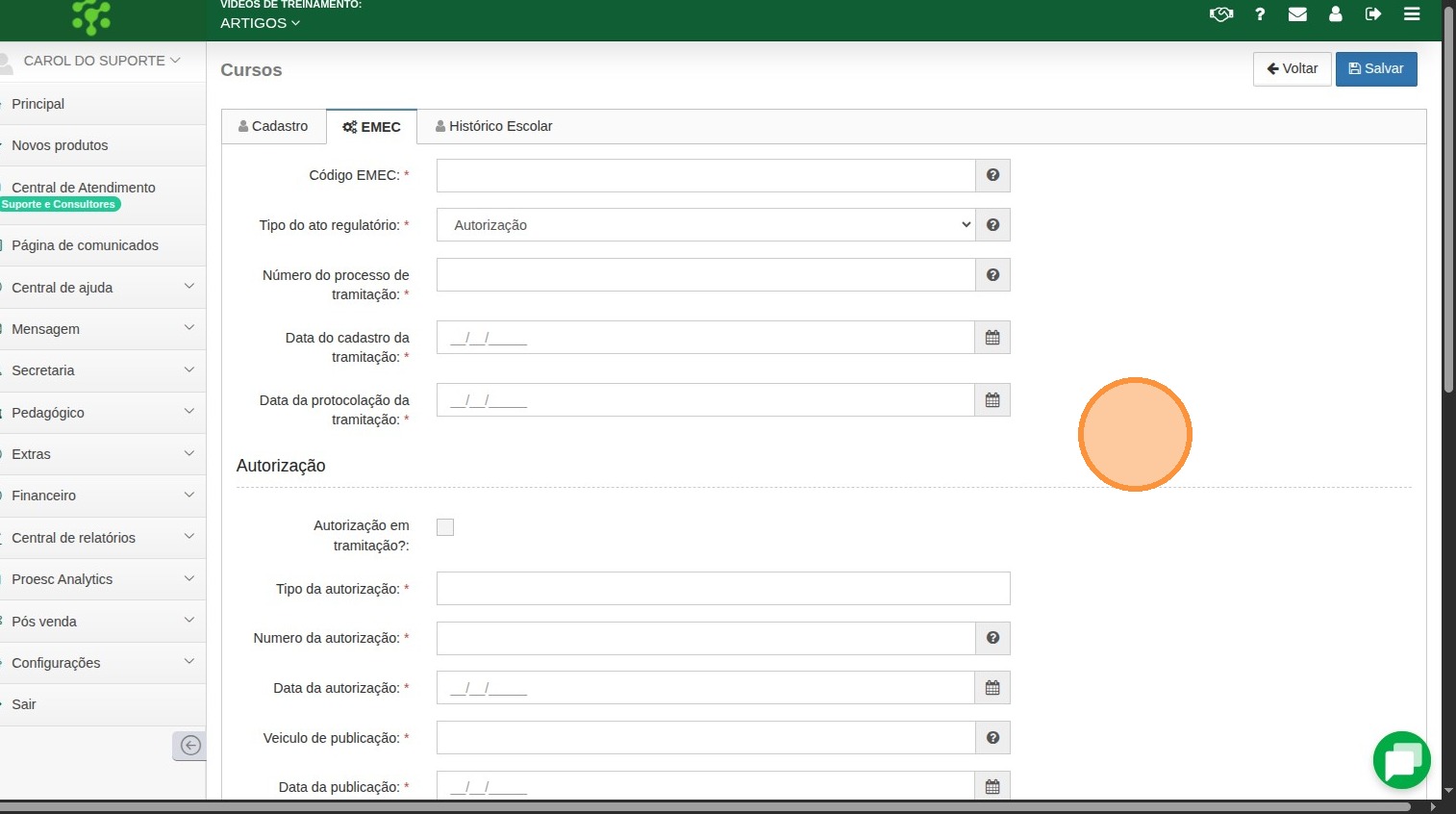 8. Clique na aba EMEC essa aba contém os campos de autorização e reconhecimento do curso, conforme exigências do MEC.