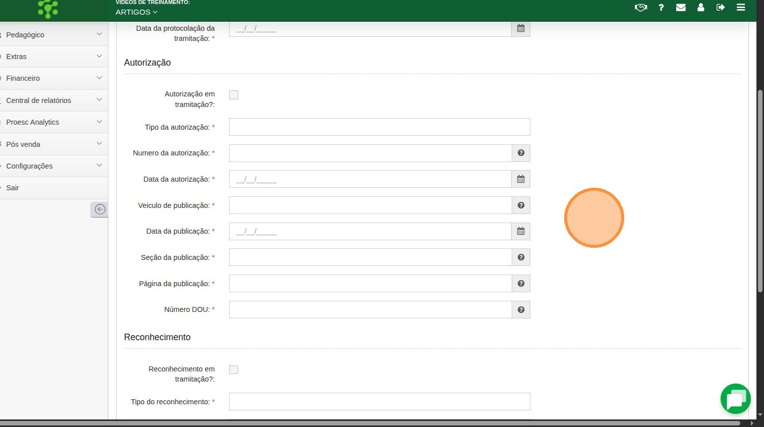 Caso algum campo não apareça, entre em contato com o Suporte do Proesc para confirmar a liberação em produção.