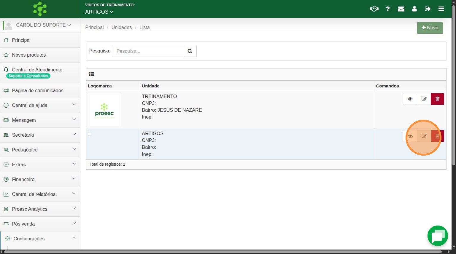 - Clique no ícone ✏️ “Alterar este registro” para abrir os dados da unidade.