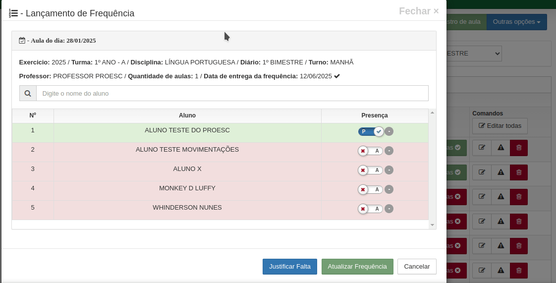 Quando a justificativa e registrada no registro de frequência do aluno fica identificado como Justificativa.