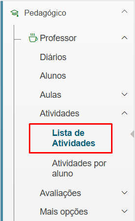 Acesse o menu Pedagógico > Professor > Atividades > Lista de atividades.