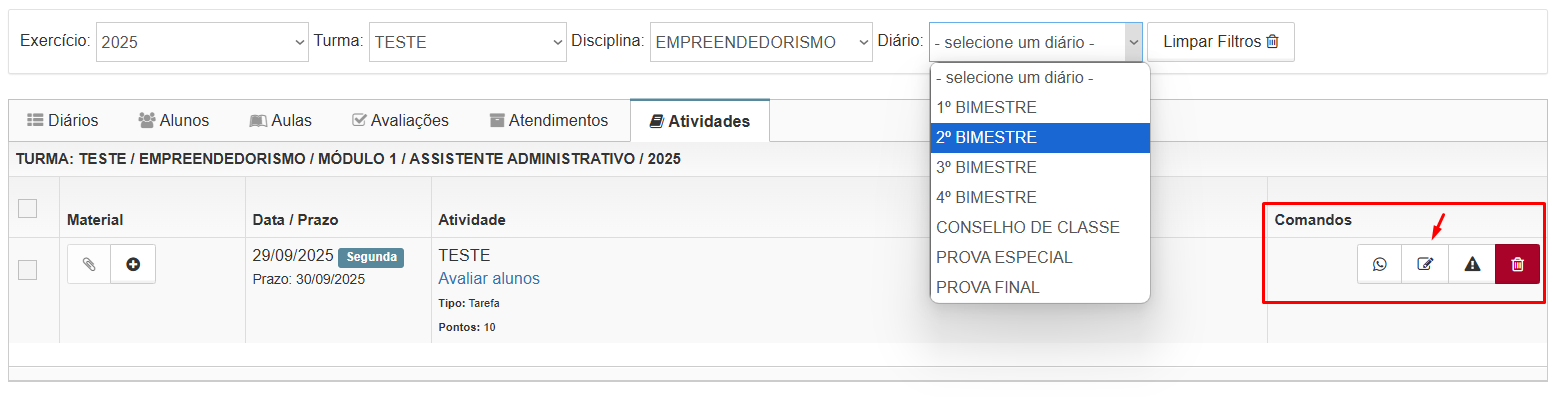 Em seguida, faça os devidos filtros como disciplinas e período e clique no botão de edição da atividade.