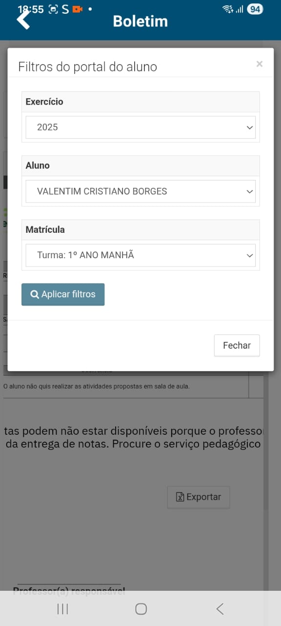 A seguir, selecione o exercício, nome, matrícula e clique em "Aplicar Filtros":